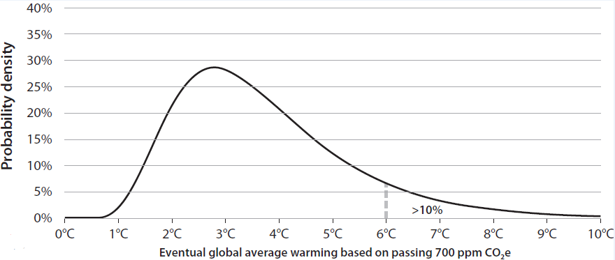 The difference between 1.5 degrees and 2 degrees is, by itself, significant (definitely click this link for the loveliest infographics). But, as the graph below shows, we have about a 10% chance of global average temperatures increasing by 6 degrees Celsius.