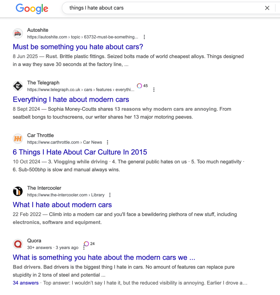 So, for the still-enamoured, here are are ten things I hate about cars.